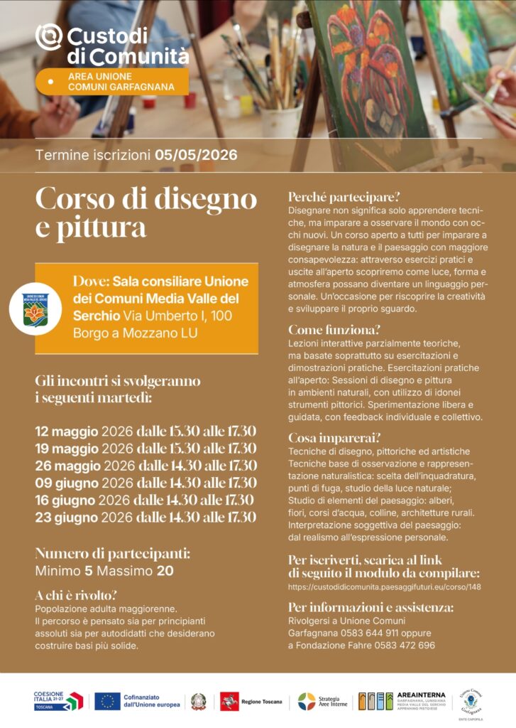 Il Corso di disegno e pittura si terrà nei mesi di maggio e giugno in orario pomeridiano presso la Sala consiliare Unione dei Comuni Media Valle del Serchio in Via Umberto I, 100 a Borgo a Mozzano. Il percorso è pensato sia per principianti assoluti sia per autodidatti che desiderano costruire basi più solide.