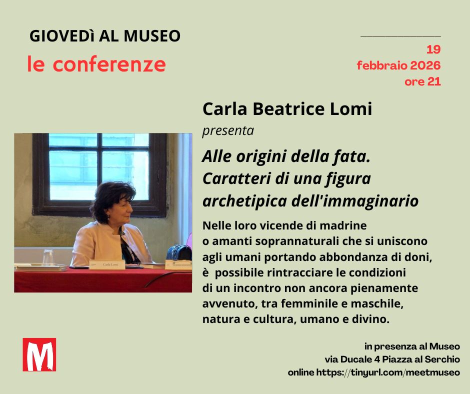 Si parlerà di fate, creature arcane complesse e ambigue, presenti da tempo immemorabile nell'immaginario universale, nell’appuntamento del 19 febbraio alle ore 21 dei Giovedì al Museo dal titolo Alle origini della fata. Caratteri di una figura archetipica dell'immaginario, ospite Carla Beatrice Lomi. È possibile assistere all’incontro unicamente online, prenotandosi al link: https://bit.ly/febbraio26; si rilascia attestato di partecipazione su richiesta.
