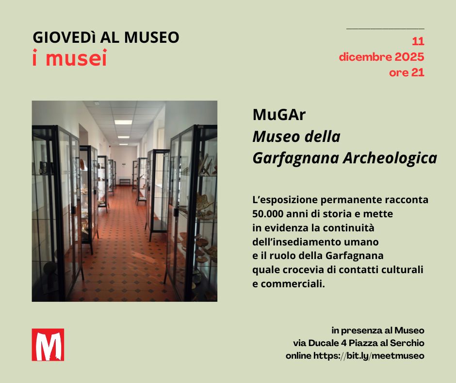 Inaugurato a giugno 2025, MuGAr - Museo della Garfagnana Archeologica si presenta ai Giovedì al Museo nella serata dell’11 dicembre alle ore 21 in presenza alla Sala della Narrazione del Museo Italiano dell’Immaginario Folklorico: intervengono la Dott.ssa Marta Colombo, Funzionaria archeologa responsabile per il territorio, il Dott. Silvio Fioravanti, archeologo, Annarita Fiori in rappresentanza del Comune di Pieve Fosciana e Margherita Leone, studentessa magistrale e volontaria di servizio civile presso MuGAr.