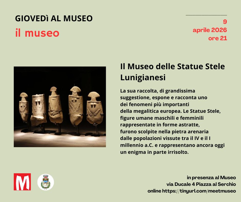 Il Museo delle Statue Stele Lunigianesi, il più rappresentativo in Italia per numero di esemplari raccolti e per la documentazione sui siti di rinvenimento, sulla materia prima utilizzata e sulle tecniche di lavorazione, illustra la collezione e le proprie attività in presenza alla Sala della Narrazione del Museo Italiano dell’Immaginario Folklorico il 9 aprile alle ore 21 per i Giovedì al Museo: intervengono il Direttore Arch. Nicola Gallo e la Dott.ssa Marta Colombo, Funzionaria archeologa responsabile per il territorio. È possibile assistere all’incontro sia in presenza che online, prenotandosi al link: https://bit.ly/giovediaprile
